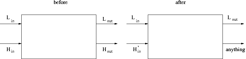We define noninterference as changes in H inputs do not cause changes in L outputs. Suppose that the program, represented by the box below, satisfies noninterference. We can then consider what the possible outputs would be if Lin remained constant and Hin changed. Since the only difference in the two executions of the program is the initial values of high variables, the output values of low variables cannot be different. Hout, however, can be changed, since noninterference does not put any restrictions on the output of high variables.