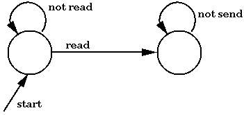 Almost all of the mechanisms for security that we have discussed this semester are EM mechanisms, including access control, and policies such as "service is available within three seconds." However, the policy "eventually service is available" is not EM-enforceable. We noted in the last lecture that information flow is not EM-enforceable, either. The properties of security policies listed above encapsulate what are known as safety properties. All safety properties can be characterized by automata. Here is an example of such an automaton.