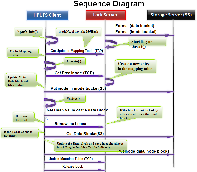 3.1 Asynchronous libasync Since HPUFS is a network file system, it should have facility to serve multiple clients simultaneously. In order to provide asynchronous behavior between multiple clients accessing the same file system, asynchronous I/O library, Libasync is used. This is an essential feature for managing simultaneous reads of the same file. But in case of writes to a same file, It is synchronized using locking service, where each client is not blocked for unlimited time but instead made to wait (tunable fixed duration of time. Hence, the reader-writer problem of synchronizing is much effective and realistically handled in the presence of libasync and lock server. |