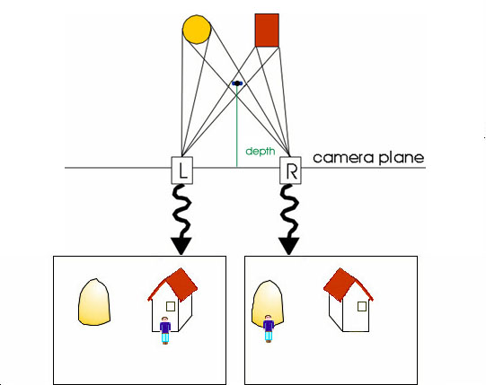 Notice that by going from the left image to the right image, the world 'moves' to the left. You can easily verify that by holding your thumb in front of your face and looking at it first with only your left eye and then with your right eye. The amount of shift of a point in the left image (in terms of coordinate distances) to the corresponding point in the right image is called its disparity. Notice also that near objects have high disparity whereas objects that are far away do not move much. That means that disparity is inversely proportional to depth, i.e. the distance of a point in the real world as measured orthogonal to the camera plane.