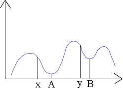 You will probably find the global minimum A if you start the search at point x, but if you start at point y, you are more likely to find the local minimum B.