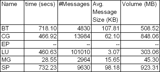 Preliminary results suggest that they can grow quite large. The table above shows the volume of messages that individual processors send when running some of the Class B NAS Parallel Benchmarks on 16 processors of the CTC Velocity cluster. These results suggests that message-logging may require too much memory in order to be practical to implement. Unless, of course, techniques can be developed to reduce the size of the message logs.