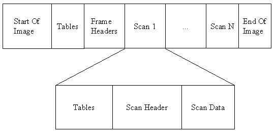 A JPEG image begins and ends with a SOI (Start of Image) and EOI (End of Image) marker. In betwee, a JPEG Image have an optional table section (Huffman table, quantization table) followed by a Frame Header. THe Frame header always exists and contains information such as the width and height of the image. The Frame header is then followed by a series of scans.