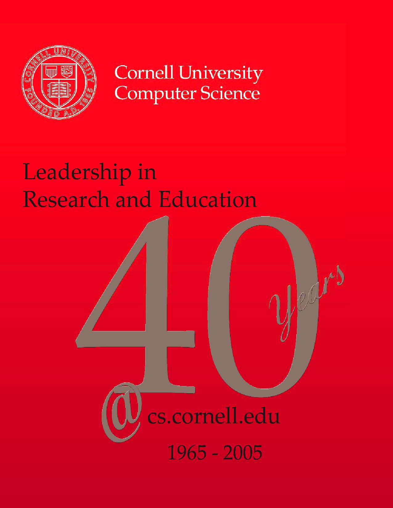 On 1 October 2005, the Cornell CS Department held a symposium to celebrate its 40th anniversary. A 50-page booklet was written to accompany the symposium. It is available below. Click on the image to the right for a jpg file of the cover. All other links below are to pdf files.