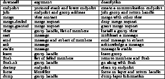 When creating an endpoint, a process describes, at run-time, what stack of protocols it needs, and a base endpoint to build it on. A process is allowed to put multiple endpoints on a single base endpoint. This way, a tree or cactus stack of protocols can be built. Given an endpoint and a group address, a process can join a group of endpoints. Eventually, this results in a VIEW upcall which describes the set of endpoints the process can communicate with. In case a membership layer is part of the stack, every endpoint in the view is guaranteed to have been sent the same view.