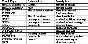 For protocols to be stacked in any order, it is necessary that all protocol implementations use and supply the same interface. The Horus Common Protocol Interface (HCPI) is designed to be rich enough to support the features of most protocols, and has support for optional extensions. HCPI consists of a set of downcalls and upcalls. The interface provides for multicasting messages, installing views, and reporting error conditions. The HCPI is designed for multiprocessing, and is asynchronous and reentrant. See Tables 1 and 2 for a complete list of upcalls and downcalls. The HCPI allows users considerable flexibility in stacking the layers. Of course, certain protocol layers require that other layers be stacked above or below them, as described in Section 6.