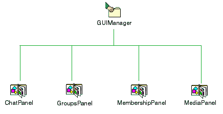 The main Graphical User Interface component in this project is the GUIManager that handles all the user events through the lightweight Java Swing component. There are four major sub-components that are one level below GUIManager: ChatPanel, MediaPanel, MembershipPanel and GroupsPanel.