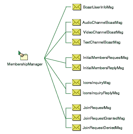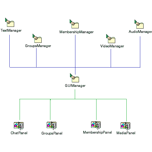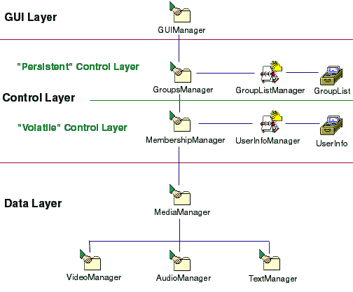 All the data components and both the inter-group and intra-group membership components extend an abstract class called Manager. Manager class is an abstract class that defines various instance variables and methods that are common to all "channel manager", regardless the data-types they are dealing with, such as channel name, group name, connecting to a group, disconnecting from a group and naming the channel according to specific convention. Various "channel manager" such as MembershipManager, GroupsManager and MediaManager extend the abstract class Manager.