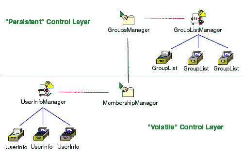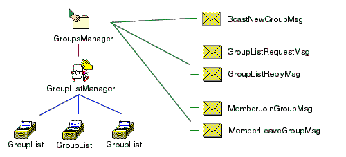 The inter-group membership handler in the "persistent" Control Layer is GroupsManager. It runs the inter-group membership protocol to ensure that it has the most current information about all the groups as well as each of their group members on the server. It listens for control messages in the default channel called grouplist control messages.