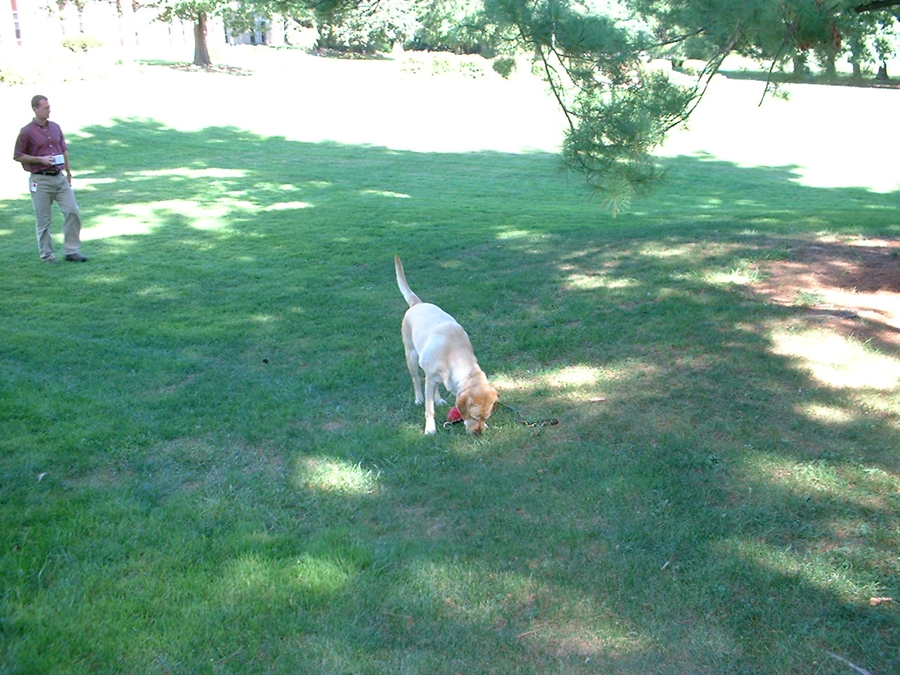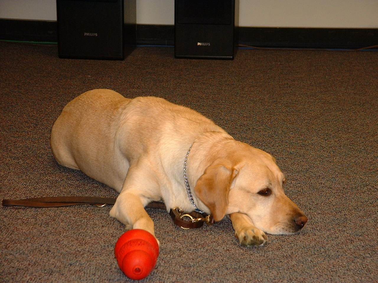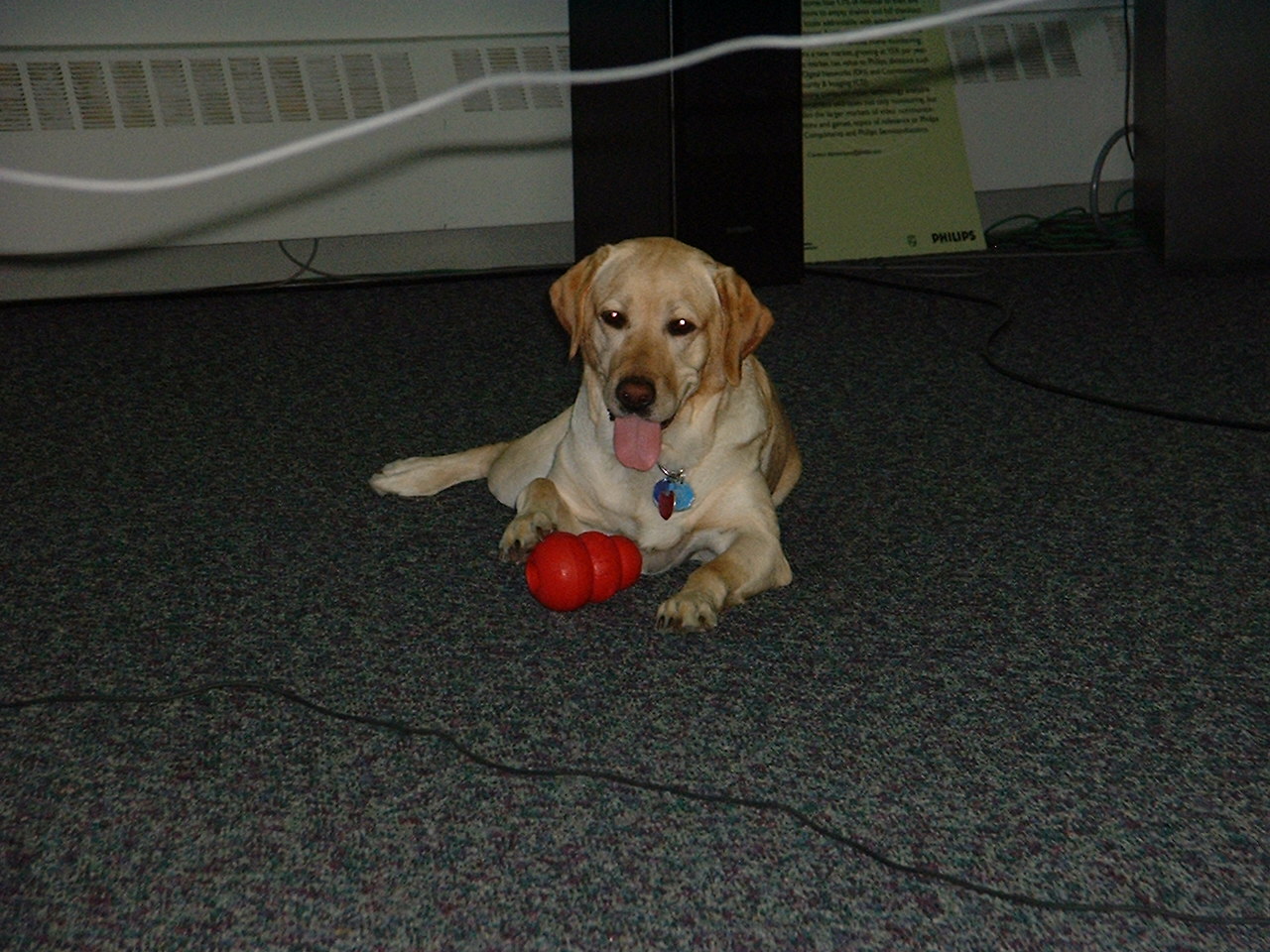 John Boyer throws her toy. The photo shows Hubble in mid-air,