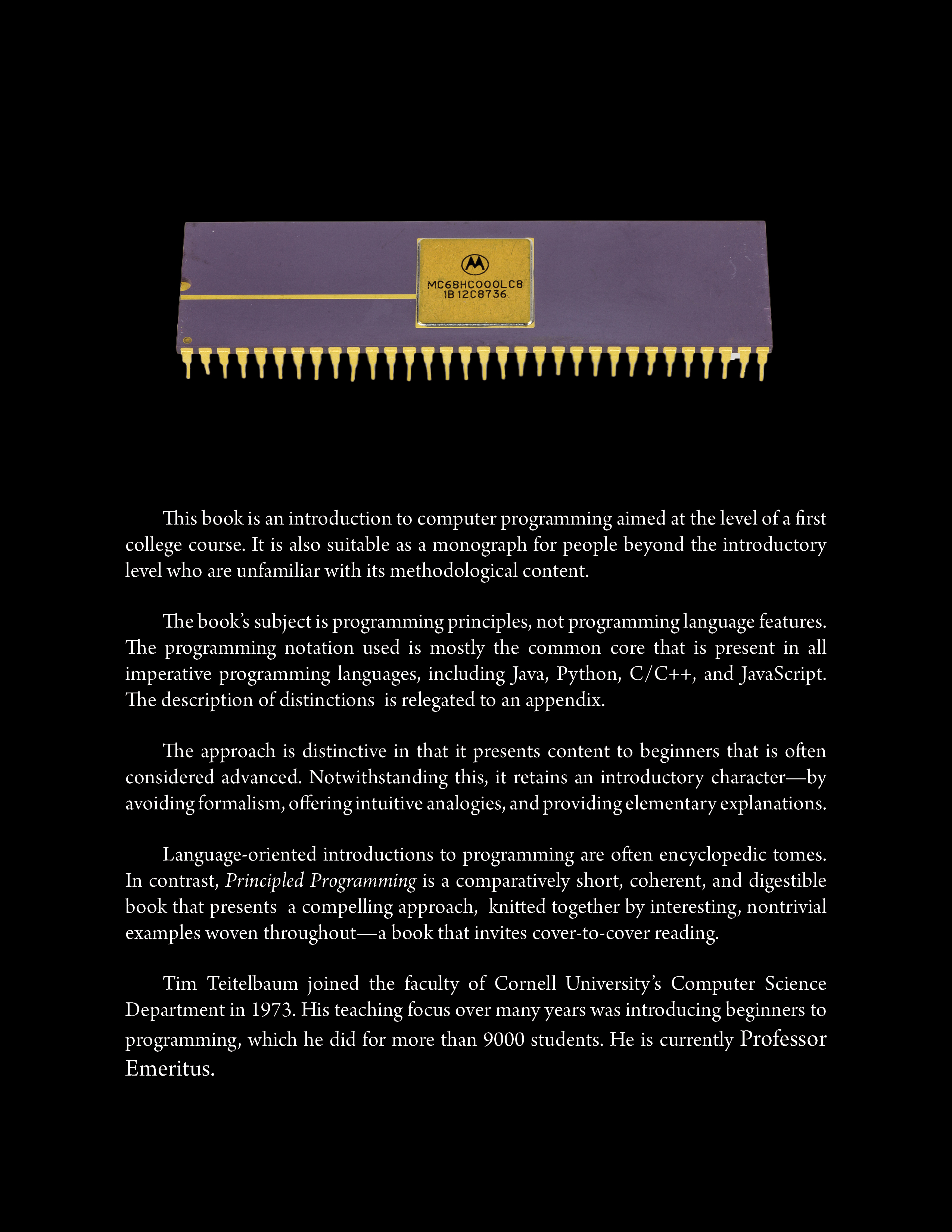 Language-oriented introductions to programming are often encyclopedic tomes. In contrast, Principled Programming is a comparatively short, coherent, and digestible book that presents a compelling approach, knitted together by interesting, nontrivial examples woven throughout --- a book that invites cover-to-cover reading.