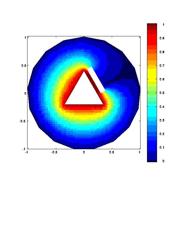 Finally, the color plot of the finite element solution with mixed boundary conditions looks like this. (Note: in Matlab and postscript the color map has more gradations than the following gif image.)