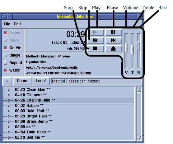 The controls in the upper right part of the client are the normal controls a CD player uses to control playback. The play button begins play of the current selection (shown in the listing window), and the pause button temporarily suspends playback. The skip buttons may be used to skip to the beginning and end of the current track, and the stop button stop playback. The eject button may be used to eject the tray of the cdrom drive on the local machine.