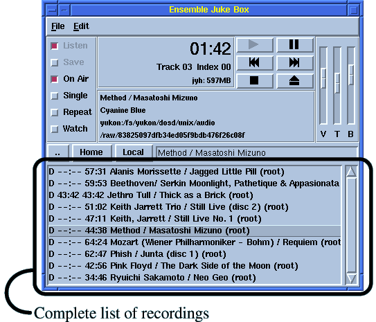 Entries in the listing can be selected. By double clicking on an entry, the directory will show the track listing for the CD. Alternatively, pushing play button will begin playback of the selection.