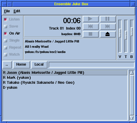 Each active user is listed in the uppermost directory as a Radio Station. If they are playing anything, and if they have selected the On Air radio button, the title of their selection is listed to their name. By selecting their entry, you can listen to the music that they're playing. This allows each user to simulate a radion station, where subscribers listen through the user's entry in the radio directory.