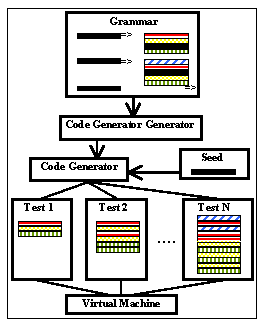 Our approach to test generation is to use an automated, well-structured process driven by a production grammar. A production grammar is the opposite of a regular parsing grammar in that it produces a program (i.e. all terminals, or tokens) starting from a high-level description (i.e. a set of non-terminals). The composition of the generated program reflects the restrictions placed on it by the production grammar. Figure 1 illustrates the high-level structure of the test generation process. A generic code-generator-generator parses a Java bytecode grammar written in lava and emits a specialized code-generator. The code-generator is a state machine that in turn takes a seed as input and applies the grammar to it. The seed consists of the high-level description that guides the production process. Running the code-generator on a seed produces test cases in Java bytecode that can then be used for testing.
