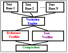Figure 5. Comparative Evaluation. A variation engine injects errors into a set of test bases, which are fed to two different bytecode verifiers. A discrepancy indicates an error, a diversion from the specification, or an ambiguity in the specification.