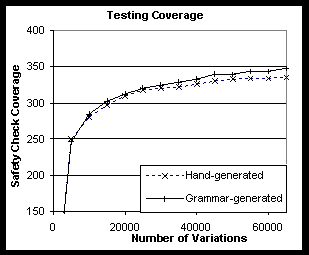 We found that the complex test cases generated by production grammars achieved as good as or better code coverage than the best hand-generated tests, had higher value coverage, and were in addition much easier to construct. Figure 6 examines the number of safety axioms in our verifier triggered by a hand-generated test base versus a test base generated by a lava grammar. The hand-generated test case was laboriously coded to exercise as many of the features of the Java virtual machine, in as diverse a manner as possible. The graph shows that automatically generated test cases exercise more check instances than hand-generated test cases. Indeed, after 30000 variations, the coverage attained by automatically generated test cases is a strict superset of the manually generated tests. We attribute this to the greater amount of complexity embodied in the test cases generated by the grammar. Further, the tests that are exercised only by grammar-based tests are those cases, such as polymorphic merges between various types at subroutine call sites, for which manual tests are especially hard and tedious to construct.