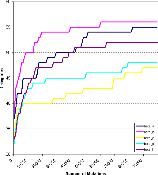 In figures 2 and 3, we show the number of axiom categories covered versus the number of mutated class files that were fed into our verifier. Note that the mutations are not cumulative, that is, each mutated class file differs from the base class file by one byte. Even though we expected one-byte errors to be limited in the breadth of coverage they can generate, we found that the automatically generated test suite has broad coverage. As shown in Figure 3, the test suite exercises 65 of the 69 categories of checks made in our verifier. Figures 4 and 5 show the coverage information on an axiom granularity. 495 checks out of the 595 axioms in our verifier are individually triggered. Note from Figures 4 and 5 that even after half a million iterations on five different bases, check coverage has not flattened out. We expect that the coverage would increase with more iterations of the generator.