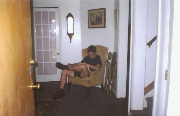..a vchodovu halu. Vpravo vidno schody hore a dvere do kuchyne.