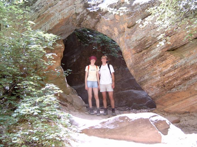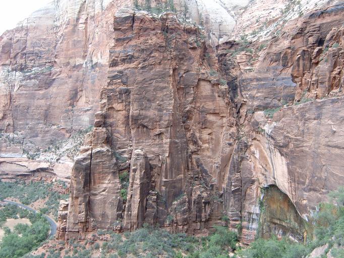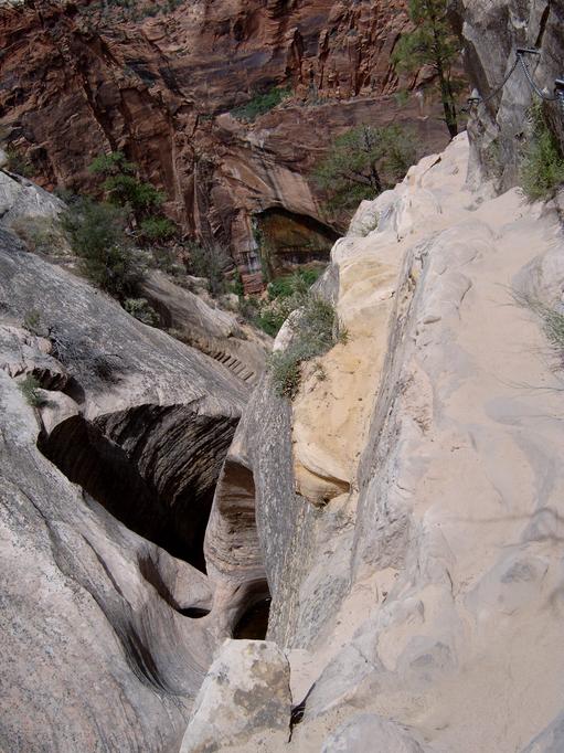 Ten obluk v lavom dolnom rohu je Weeping Rock -- placuca skala. Medzi dvoma nepriepustnymi vrstvami je vrstva pieskovca, v ktorej sa hromadi voda ked naprsi a postupne kvapka.. |