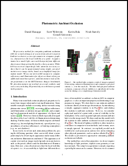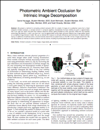 We present a method for computing Ambient Occlusion (AO) for a stack of images of a scene from a fixed viewpoint. Ambient occlusion, a concept common in computer graphics, characterizes the local visibility at a point: it approximates how much light can reach that point from different directions without getting blocked by other geometry. While AO has received surprisingly little attention in vision, we show that it can be approximated using simple, per-pixel statistics over image stacks, based on a simplified image formation model. We use our derived AO measure to compute reflectance and illumination for objects without relying on additional smoothness priors, and demonstrate state-of-the art performance on the MIT Intrinsic Images benchmark. We also demonstrate our method on several synthetic and real scenes, including 3D printed objects with known ground truth geometry. |