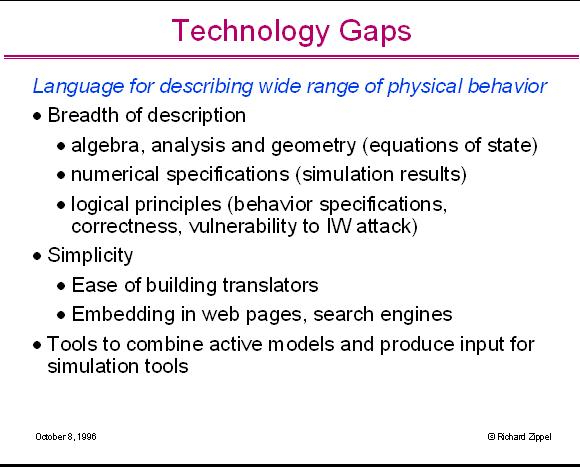 The deepest and most serious technology gap in what we are proposing is developing a language for describing the wide variety of different physical mechanisms that may arise in a design project. Each component may be analyzed at a variety of different levels of detailsometimes beams are viewed as rigid lumped parameter objects, sometimes they are continuous and must be analyzed with finite element methods. Sometimes the mechanical aspects are important, other times the electro-magnetic, or chemical aspects need to be included. How does one combine all of these different ways of looking at a physical object into a coherent, computationally effective structure? When one combines representations of different parts, how does one extract the relevant descriptive information in form that can be combined to produce an efficient simulator.