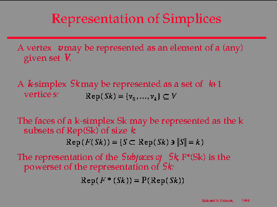 This slide shows how the definitions for vertices, simplexes may be formalized in terms of sets, and the illustrates how the face operation is expressed in terms of sets.