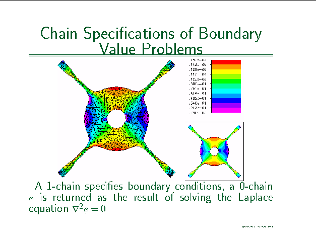 As a first application of the use of chains, we note that boundary value problems can be specified, and the result of their solution return via finite chains. As an example, we may specify the boundary conditions for the Laplace equation by defining a 1-chain on a 1-complex representing the boundary of a 2 dimensional region. The result can be returned as a 0-chain. This shows how the computer implementation of chains provides a uniform means of incorporating ``legacy codes'' into the SimLab environment.