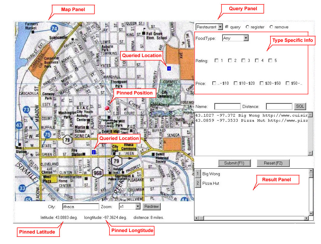 QueryPanel presents the user with three functionalities: Query, Register, and Remove. 'Query' lets the user search for several categories of locations. 'Register' can insert records into the database, and 'Remove' deletes the record from the database. Depending on the categories selected, the QueryPanel will display the corresponding info panels.