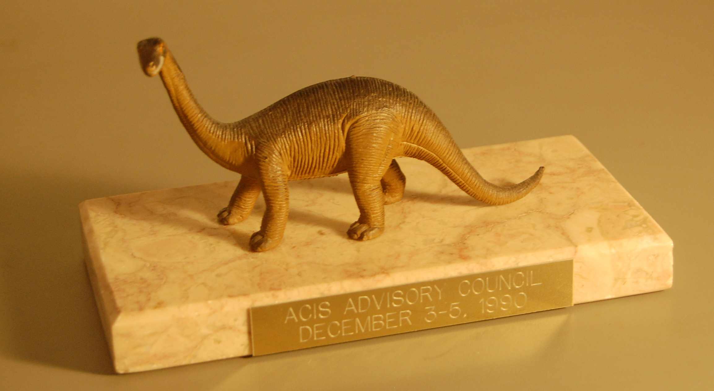 As personal computer replaced mainframes, the mainframes were colloquially referred to as "dinosaurs". This dinosaur was a gift from IBM after an advisory board meeting.