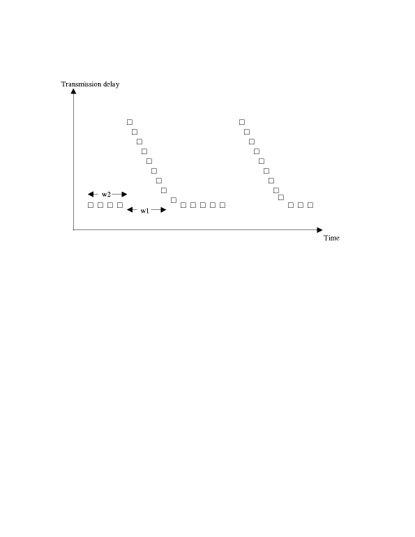 Before presenting the algorithm, we first give an intuitive idea of how to choose the optimal delay. We are primarily concerned with two sources of delay: transmission delay and buffering delay. Let p_hat be the sum of transmission delay and buffering delay. Clearly, for each packet,