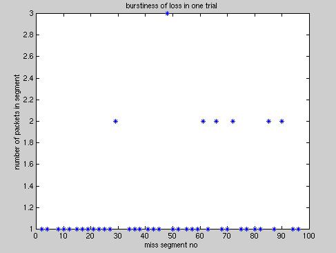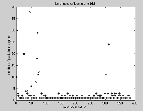According to the experimental data, it is convenient conceptually to divide connections into three classes: 1. Connections with small delay variation and little loss. Typical bursts of loss has width 1. 2. Connections with small delay variation and many small bursts of losses. Typical bursts of loss has width 1~3. 3. Connections with large delay variation (with or without bursts of losses). If we define "loss" to be either truly lost or too late to be played, the bursts of loss typically has width more than 6.