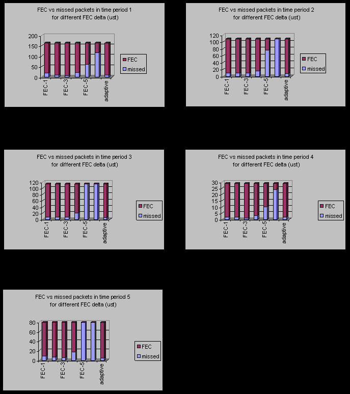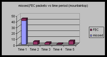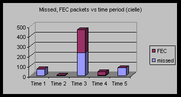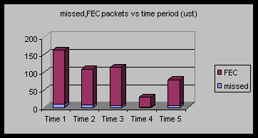 Class 3 connections typically has large delay variation. Even if there is no truly lost packets, many packets arrive too late and are considered as "missed" by playout algorithm. So typical bursts of "loss" have width more than 6. In the adaptive FEC algorithm, # of consecutive in-time packets may not be large, max # of consecutive missed packets are typically > 6 (the width of burst can go up to more than 100!), # of packets tolerated by buffering delay depends on the estimation of the buffering delay (safety-factor + Beta * variation of delay). So FEC_DELTA is constrained by the estimation of the buffering delay in this case. For packets missed due to large delay variation, FEC data, typically arriving after the PCM data, will be too late to rescue. So for class 3 connections, though FEC can save some of the truly lost packets (if there are some) and late packets, generally FEC is not effective in this case. Fig 2.3 shows the missed and FEC-saved packets for the connection from sender machine to www.cielle.com, which exhibit class 3 behavior in time periods 1,3,5 (See Appendix 3). In time 1 and 5, no actual loss happened and FEC data (too late themselves) saved no packet at all. In time 3, there are lost packets and too-late-to-be-played packets, FEC saved around half of them.