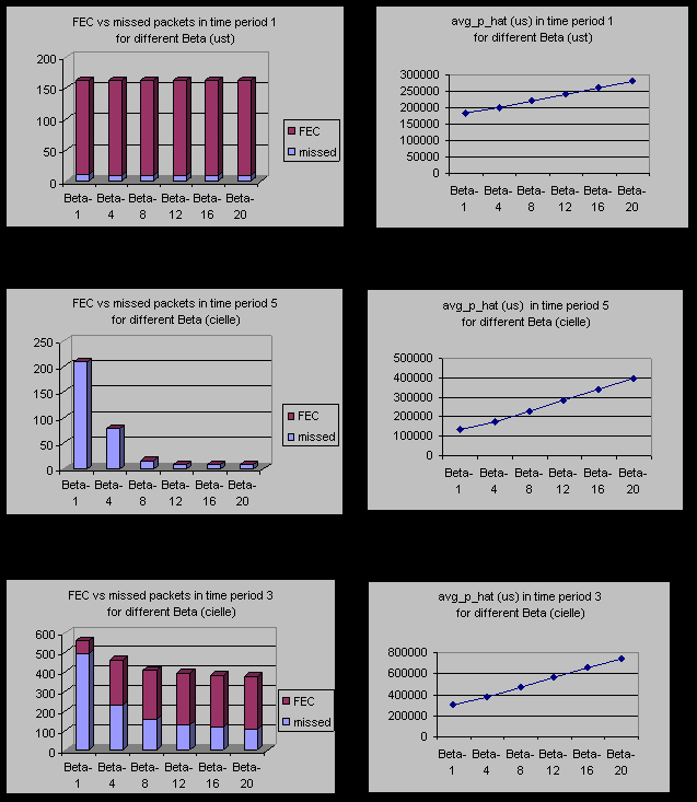 These two reasons combined, FEC may save more packets. We skip class 1 case because FEC with delta 1 can deal with lost packets decently. Fig. 3.1 illustrates for class 2 connection (sender machine to www.ust.hk in time period 1), and for class 3 connections (sender machine to www.cielle.com in time period 3 and 5), the different effects of changing Beta. Only in the cielle time period 3 case, when FEC can actually save some lost and too-late packets, changing Beta will benefit us, at the cost of increasing the buffering delay. So the choice of Beta is a tradeoff between buffering delay and number of saved packets. And increasing Beta is only effective for some class 3 connections.