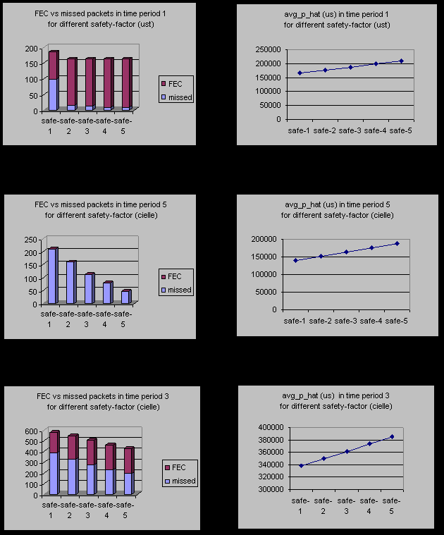 Fig. 4.1 illustrates the effect of safety-factor on the delay and FEC performance for the same connections as in Fig. 3.1. Note that safety-factor directly affects delay of each packets we record, the increase of safety-factor will be directly reflected to d, v and p_hat, whereas the effect of changing Beta is amplified by variance of delay. So if the variance of delay is large (as in cielle time 5), the increase of normal packets due to changing of Beta is greater than that due to changing of safety-factor. If the variance of delay is small (as in ust time 1), reducing safety-factor to be 1x time_per_packet will affect FEC-saved packets more negatively than reducing Beta to 1.