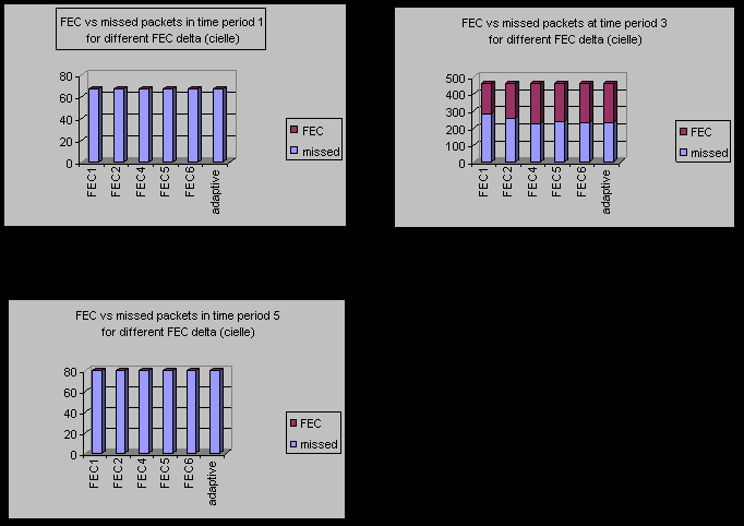 For class 3 connections (Fig. 5.2), since the bursts of loss packets are of large width, basically FEC delta need to be large. But since the delay is worse, with large FEC delta, FEC data is prone to be late. So FEC delta is a subtle tradeoff of these two factors. For example, for cielle, seems FEC delta = 4 or 6 is best for time 3.