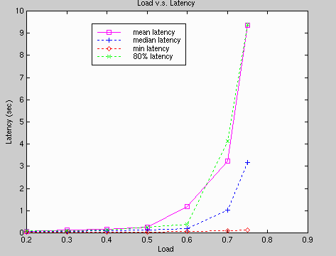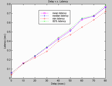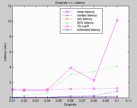 From the simulation data, we can see that in general, mean latency increases linearly with the average packet delay (Figure 2.3), but exponentially with high drop rate ( drop rate > = 10% ) (Figure 2.4), and the impact of load on latency is the combination of these two (the exact "combination" need to be further studied) (Figure 2.5). As [2], we observed that the latency displays heavy tails and high variance, particularly for long transfers with high loss rates. [2] proposed an analytical model for estimating the median latency. For comparison, Figure 2.4 also shows the estimated median latency (the "estimated latency" curve).