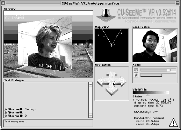 CU-SeeMe VR merges the CU-SeeMe video teleconferencing application [2] with a fast 3D graphics engine to create an immersive 3D chat environment. Live video feeds from conference participants are projected onto 3D walls that roam around in a virtual conference room. The user freely navigate around the 3D world. The interface draws on user intuition: the interaction metaphors in a physical conference room carry over to the virtual world. If you want to talk to someone, you walk up to them. If someone is offensive or boring, you can move away. And as in reality, they can follow you around. This conference room is virtual- two people next to each other in virtual space could be thousands of miles away in reality.