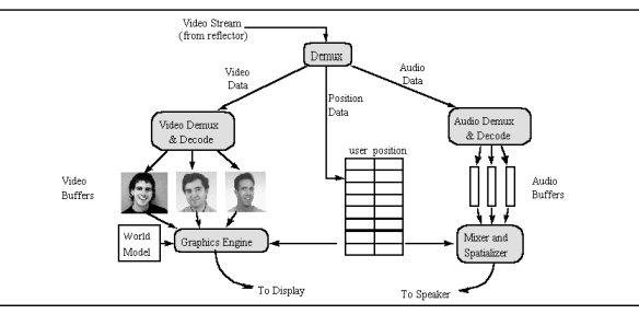 The receiver's software architecture is more complex, and is shown in figure 2. The receiver splits the video stream into audio, video, and 3D position streams (other auxiliary data, such as textual chat data, is not shown). 3D position data consists of two triples. One triple specifies the user's position (x, y, z), and the other thriple specifies a normal vector (nx, ny, nz) that gives the direction the user is facing. These triples are recorded in a table, indexed by user id. Video data is decoded by the CU-SeeMe video codec and saved in a video buffer. A separate video buffer is maintained for each user. The 3D graphics engine combines the decoded video data with the model of the virtual world and the 3D position of each user to render the image on the user's display. To the codec, the video buffers are target images. To the graphics engine, they are texture maps. The graphics engine is discussed below.