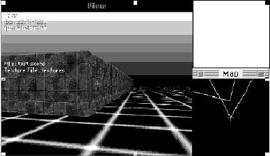 The 3D view, map view, and navigation panel are at the heart of CU-SeeMe VR. The 3D view shows a projection of the 3D world from the user's perspective. The engine used to generate this view is described below. The map view window shows a schematic, bird's-eye view of the 3D world. It helps the user to understand his position in, and navigate through, the virtual world. Finally, the navigation panel allows the user to move around in the 3D world. Holding a mouse button down on the upper arrow moves forward, on the lower arrow moves backwards, on the left arrow turns the user's view to the left, and on the right arrow turns the user's view to the right. Keyboard accelerators are also provided for these functions. The map and 3D view are updated in real-time to reflect the changed positions.