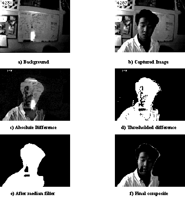 The segmentation algorithm can be further improved by using a color video input source. Although the CU-SeeMe video codec discards color information, we can use color information to discriminate between the foreground and background. We have experimented with several color distance metrics, such as distance in UV space and normalized chroma (U/Y, V/Y). We are also exploring the use of multiresolution techniques to segmentation. Evaluating differences at coarser resolutions should help remove artifacts as well as improve performance.
