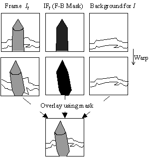 We use the binary maps IF and JF to partition each image in the image sequences into foreground and background components. We morph each part using the Beier and Neely algorithm and overlay the results. With this scheme, step 1 in figure 1 is expanded into 3 warps and one overlay, as shown in figure 4.