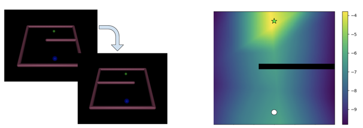 Left: Illustration of the shifting maze task, where the agent (blue) must reach the goal (green). During training the agent must go around the wall on the left side, but during test time it must go around on the right. Reward learned on the point mass shifting maze task. The goal is located at the green star and the agent starts at the white circle. Note that there is little reward shaping, which enables the reward to transfer well.
