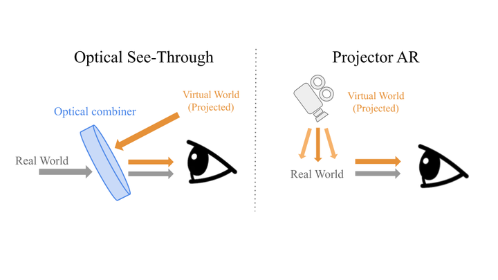 Illustration of the image formation process in augmented reality settings. Left: optical see-through setting. Right: projector AR setting. In both settings, the image is created by adding light to existing light sources from the real world, which motivates the non-negative image generation problem.